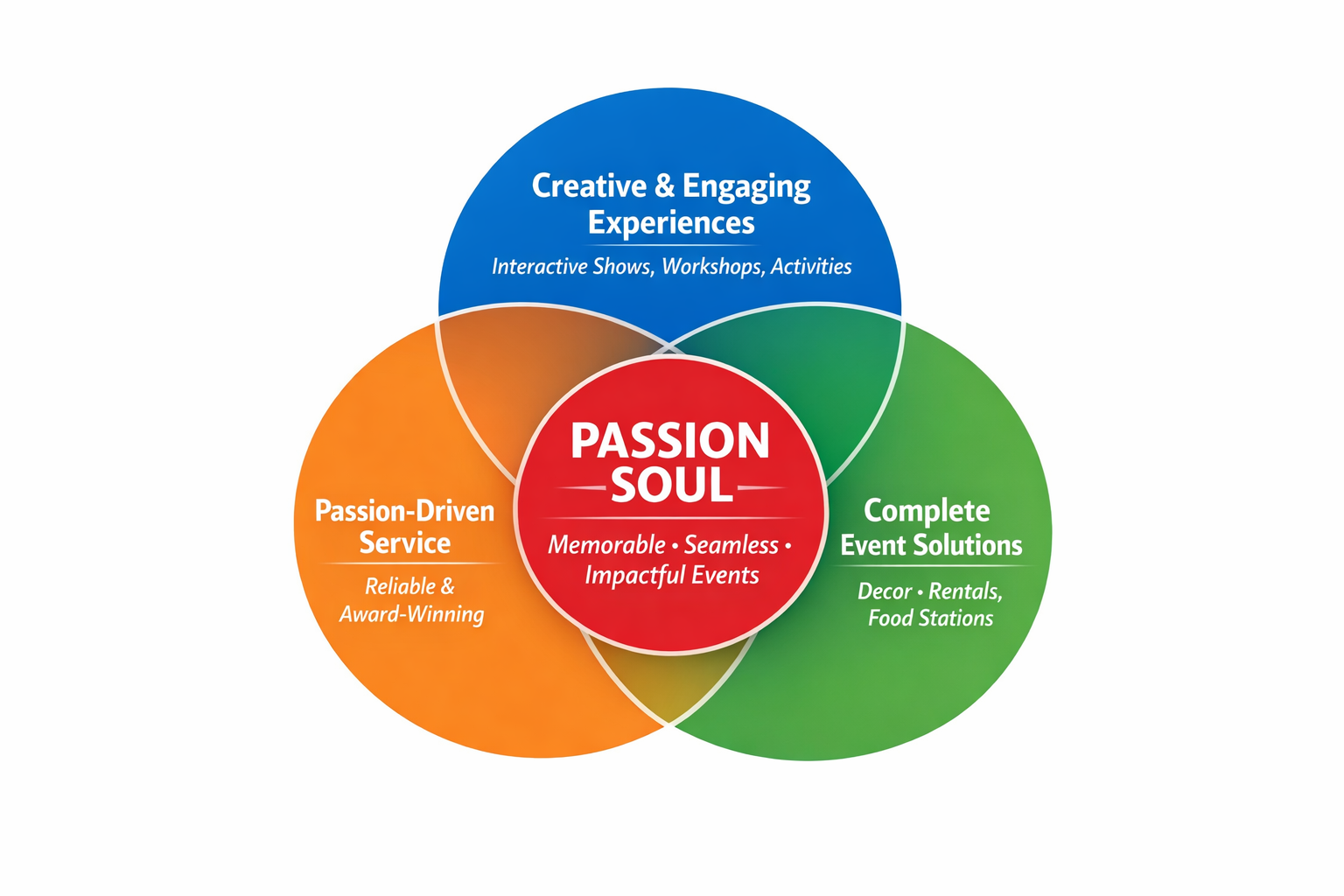 Passion Soul Pte. Ltd.™ creates unforgettable celebrations through a powerful combination of creative entertainment, complete event solutions, and passionate service. From performances and hands-on activities to decorations, rentals, and live food stations, Passion Soul provides a seamless one-stop event experience that makes planning effortless while delivering engaging and memorable moments for every audience.